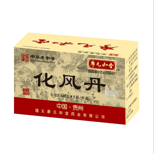 化风丹为朱红色丸剂,剖面呈棕黄色,味辛。对四时瘴气、中风偏瘫、小儿高热惊风、癫痫、面肌麻痹有特效。由于此药功效确切,传至二三代声名鹊起,在云、川、黔、滇、桂广为流传,被誉为“居家旅行之必备圣药”。1710年,廖家正式命名此药为“廖元和堂化风丹”。 <br />