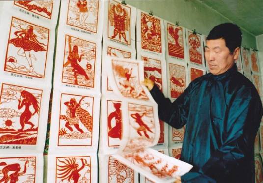 关云德剪纸是吉林省九台市省级非物质文化遗产代表性项目,属民间美术类,2006年获批。该技艺由满族农民关云德传承,以满族萨满文化、民俗传说为核心内容,融合传统剪纸技法与民族文化记忆。其创作题材涵盖萨满神像、玛虎面具、满族挂笺等民族图腾与民俗场景,采用剪、刻、熏等技法,保留灯烟熏纸等古法工艺,材料承袭满族先民使用兽皮、鱼皮的剪刻传统。作品以粗犷简练的北方乡土艺术风格记录祭祀习俗与生活风貌,形成兼具文献价值与审美功能的艺术体系。关云德自幼继承家族剪纸技艺,在传统祈福巫术功能式微的背景下,通过农闲创作维系技艺传承。作品以家族传承为脉络,曾参与全国展览并获奖,2010年作为萨满文化载体亮相上海世博会,成为民族文化对外展示的典型案例。