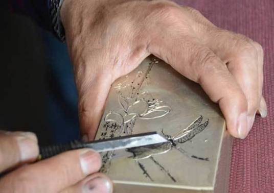 <p>饶阳刻铜,其技法娴熟、功力深厚,手执刻刀在铜质器皿上镌刻书画,以刀代笔,以铜面作纸绢,运用或老辣、或古拙、或奔放、或细腻的刀法,通过采用冲、切、挑、铲等技法,铜铁相搏,铿锵奏进,镌刻出阴阳、虚实、飞白的阴文刻、阳文刻、双钩线刻等作品。饶阳刻铜在工艺上汲取了平雕、竹刻、篆刻等技法精华,题材广泛,汇诗书画印成一器,既还原了原画稿,又具有浓厚的金石韵味,这也是刻铜艺术独特的魅力所在。功力深厚的传承人能不借助其他工具手持刻刀直接在铜器上雕刻。其题材内容广泛,从名家字画到文人墨迹,从才子佳人的爱情故事到商贾士绅的人情友谊,乃至社会名流的政治生涯皆可作为图案进行錾刻。相关制品有铜墨盒、铜镇尺、铜插屏,以及水盂、香炉、印规、首饰盒等。饶阳刻铜以师徒传承为主要方式。</p>