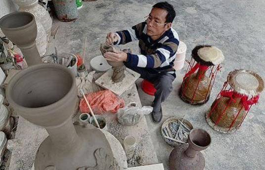 吴川瓦窑陶鼓制作技艺是流行于广东省湛江市吴川市的传统技艺,2013年被列入广东省第五批省级非物质文化遗产名录。该陶鼓原名长鼓,呈葫芦型,由吴川市梅菉街道瓦窑村陶工用陶泥烧制而成,曾作为傩舞“舞二真”的主要伴奏乐器。制作技艺包含选泥、炼泥、拉坯等七道工序。泥料取自草皮二米以下的“玉泥”,炼泥时掺入四分之一沙子揉搓。拉坯以1.2公分厚陶壁为标准,分上下两部分制作,拼接后雕刻龙凤花草图案。釉料由木柴炭、稻草灰混合制成,入窑以1000~1200℃烧制12小时。羊皮通过活结调节音色。该技艺流传数百年,省级代表性传承人梁景尤自2014年起开展传承。吴川市通过设立非遗展览厅、推动陶鼓进校园等措施加强保护。