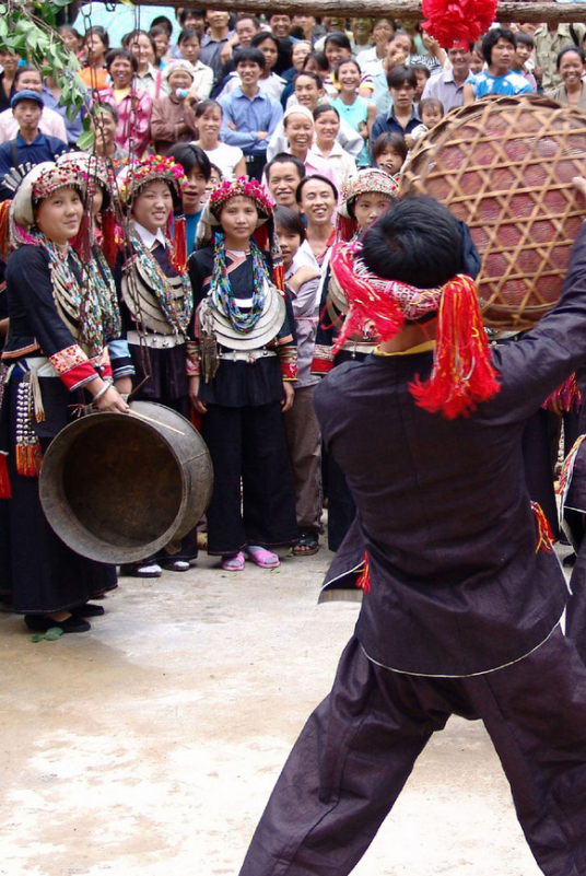 铜鼓舞是云南省文山壮族苗自治州壮族、彝族民众中流传的古老舞种,2006年5月20日经国务院批准列入第一批国家级非物质文化遗产名录(遗产编号Ⅲ-26),分布于广南、麻栗坡、富宁、西畴、马关、邱北等县的壮、彝村寨,其中广南县壮族、彝族和麻栗坡县新寨乡、富宁县木央乡彝族白倮支系的铜鼓舞最具代表性。该舞蹈以铜鼓为伴奏乐器,鼓点主导动作变化,表演形式多为群体围圈逆时针起舞,内容反映农耕生产和祈雨、丧葬等民俗活动,彝族铜鼓舞采用公鼓、母鼓组合演奏,公鼓代表太阳,母鼓代表月亮,十二调对应一年十二个月。铜鼓历史可追溯至春秋战国时期,云南广南出土的沙果鼓距今2000余年,早期作为炊具、礼器和权力象征。铜鼓舞始于壮、彝先民的自然崇拜与祖先崇拜,壮族认为敲鼓可驱邪祈福,彝族视铜鼓为万物之灵。文山州通过设立传承示范点、编入学校课间操等措施推动保护,广南县那洒镇马贵村壮族保留十二套反映全年农事的舞蹈动作,麻栗坡彝族
