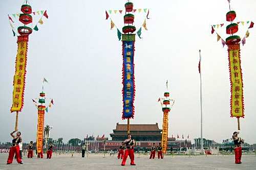 中幡表演时,艺人们将竿子竖起托在手中,舞出许多花样,其表演动作样式各有形象的名称。将竿子抛起用脑门接住为霸王举鼎,单腿支撑地面用单手托住竹竿为金鸡独立,此外还有龙抬头、老虎撅尾、封侯挂印、苏秦背剑、太公钓鱼、擎一柱等样式。考究的中幡竿顶上还有一层乃至数层由彩釉、锦缎、响铃、小旗、流苏组成的圆形装饰物,称为缨络宝盖,舞起来不仅五彩缤纷,而且发出悦耳的声音。 <br />
