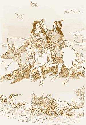 契丹始祖传说是这样的:在很久很久以前,有一神人居住在平泉县柳溪乡的光头山(古称马盂山),他骑着一匹白马沿着老哈河(古称土河)顺流向东而去。有一天女居住在西拉木伦河(古称潢河)上游的平地松林中,她驾着青牛车顺着西拉木伦河而下,两人相遇在内蒙古赤峰的木叶山二水交汇之处,辽河之畔。两人一见钟情,结为夫妻,生了8个儿子,以后族属逐渐繁盛,形成了最早的“契丹古八部”。他们各部族都供奉青牛白马,以表示用始来之物祭祀祖先。 <br />