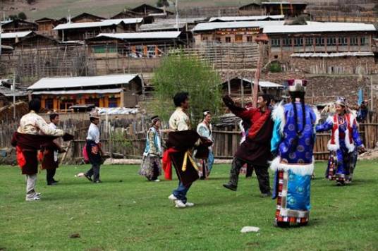 尕巴舞是甘肃省甘南州迭部县传统藏族民间舞蹈,2006年被列入第一批甘肃省非物质文化遗产名录(编号Ⅲ-10),遗产类别为民间舞蹈。该舞蹈起源于印度,公元八世纪通过吐蕃戍边将士传入迭部地区,现存于卡坝、尼傲、旺藏三乡部分村落。尕巴舞以男性表演者为主,女性围观喝彩助兴,包含敬山神、尕巴的起、偷亲、狗熊爬树、官兵出征演练等段落,分独舞、双人舞、团体舞及哑剧、喜剧、杂耍等形式。歌词采用三句体结构,涵盖情歌、神话及赞颂题材,曲调包括酒曲类、尕姆调等,其中尕姆调仅限节庆期间使用。活动通常在农历十月至十一月秋收后举行,表演者持兵器巡户驱魔并焚烧木棒,群体围火对歌直至深夜。舞蹈融合古羌祭祀与吐蕃宗教法舞元素,体现当地传统文化形态。