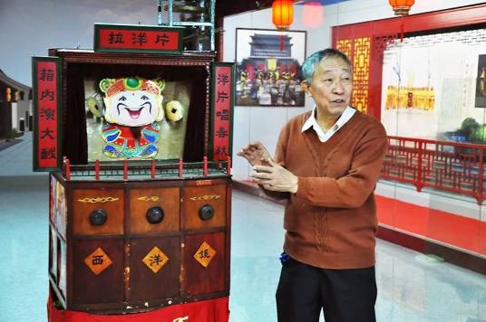 广平拉洋片是河北省广平县的传统民间艺术形式,当地俗称“西洋景”,形成于清末。其表演道具为木制箱体,高约1.5米、宽约1米,分看箱、画面、乐器三部分,正面设有四个内置凸透镜的观察孔。表演者通过左右推拉式或上下滑动式操作画面,配合鼓、锣、镲等打击乐器及方言唱段展现历史或现代场景,2008年7月被列入河北省非物质文化遗产名录。现存画面含20世纪30年代制作的《天津北马路风景》《断桥》等。第四代传承人郭玉福创新制作《东湖公园》反映广平新貌,使用北京制老道具,每月15日进行公益演出,培养十余名年轻传承人。该表演以声情并茂的方言说唱和立体画面深受观众喜爱,尤受青少年追捧,目前多见于庙会演出。