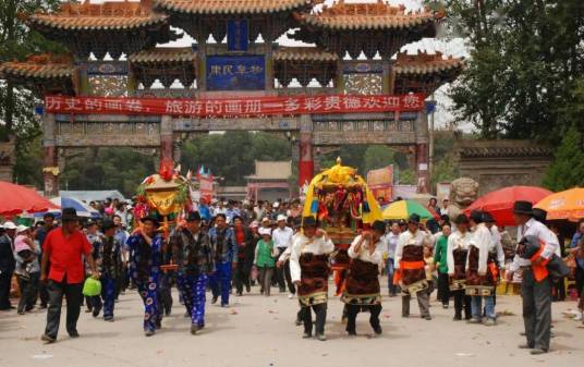 <p>贵德六月庙会具有鲜明的民族特色。自明代以来,每年农历六月十九至二十五,周屯村和刘屯村的民众将供奉在周屯二郎庙的二郎神和刘屯文昌庙的文昌神,分别请出神殿,载入神轿,开展走村转寺等活动,并形成了一套约定俗成的程序,包括祭神、请神、踩神、出马行神、拜直亥山神、五门行神、还愿关神等。首先举行神祇开光、祭神、拜神仪式。接着仪仗整齐地抬出神庙,走转寺庙。数百人的仪仗队伍,人人身穿古装长袍(周屯队穿藏服),有的举幡、举旗及黄色伞盖,有的抬轿,有的敲锣打鼓,簇拥着一顶神轿一路巡游,纷纷赶来的群众争相给神轿敬献哈达,敬献钱物。最终在距离县城2公里处的河滨公园主会场让两神相会,来回表演。表演完毕,群众祈福禳灾,求子嗣、祛病痛,求吉祥平安、五谷丰登,然后各自回庙。除表演神戏外,庙会期间还有物资交流会、藏族拉伊、花儿演唱等活动,人山人海,热闹非凡。</p>