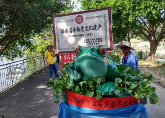 延平蛙崇拜民俗,福建省南平市延平区樟湖镇民俗,福建省省级非物质文化遗产之一。延平人素有崇蛙习俗,因而蛙神曾一度被视为延平城的保护神。随着岁月的推移,这种习俗仅在樟湖镇溪口村保留,而且是融洽附载于另一民间俗神——张公身上,张公便被视为蛙神了。这与樟湖镇驻地的蛇崇拜融合附载于连公身上,乌鸦崇拜融合附载于齐天大圣左右一样。古越先民的习俗与汉氏族习俗的融合,在这里表现的较为突出。在漳湖镇溪口村每年7月21日张公生日这天,村民们要举行盛大迎神活动。2005年,“延平蛙崇拜民俗”经福建省人民政府批准列入福建省第一批省级非物质文化遗产名录,项目编号:Ⅹ-94。