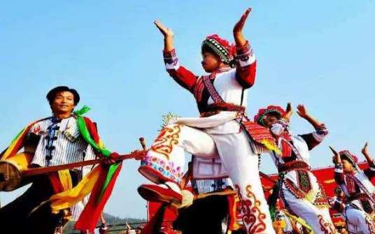 彝族三弦舞(阿细跳月),云南省弥勒市传统舞蹈,国家级非物质文化遗产之一。阿细跳月在阿细语中称为“嘎斯比”,意为“欢乐跳”,它是彝族阿细人代表性的民族民间舞蹈,源于阿细人古朴的“阿细跳乐”,因多在月光下的篝火旁起舞,故名“阿细跳月”。阿细跳月发源于云南省红河哈尼族彝族自治州弥勒市西山一带,在弥勒市彝族阿细人聚居的村寨及泸西、陆良等地广泛流传。阿细跳月参加者少则十几人,多则上千人,多在祭祀、节日、盛典时表演,具有较强的自发性、自娱性和群众性。它集歌、舞、乐于一体,有规范的舞步和套路,其舞蹈可分为老人舞和青年舞,舞步包括踹脚跳、鹤步单腿跳、弹跳步、跑步跳、转身跳、拍掌跳等形式,音乐为宫调式大三度五拍节,起舞时以大三弦、大中小竹笛、小三弦、三胡、月琴、唢呐、哨子等阿细民间自制乐器伴奏。阿细跳月节奏热烈欢快,动作豪放粗犷,舞姿矫健飘逸,韵律强劲,气势恢宏,具有较强的感召力。2008年6月7日,彝族三