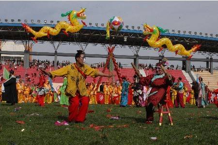 撵花是河北省临漳县西街的传统民俗舞蹈,起源于清朝乾隆年间,由开封人刘子东传授给当地村民王孟华,2006年被列入河北省第一批非物质文化遗产名录。该舞蹈因西街早年缺乏节庆文化活动而创立,表演集中在农历正月。舞队由戏曲人物及老道、琉璃鬼等特色角色构成。表演分“串街”与“打场”两种形式:串街时琉璃鬼倒行执铁链,舞队编“篱笆”“八字”等队形;打场则由琉璃鬼与丑婆完成钻凳、顶油碗等即兴动作,伴奏采用抬花轿等民间乐曲。舞者需长期练习“圆场步”以保证动作流畅。近年来通过开办培训班、融入现代元素及网络推广,该艺术形式持续活跃于各类节庆展演。