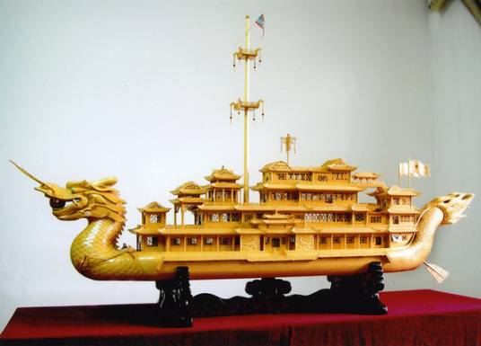 木雕船模是流传于湖北省武汉市的一种传统雕塑艺术,它创始于清末,至今已有百年左右的历史。宜昌艺人龙启胜原来开设小作坊从事船模制作,经过五代人的传承发展,逐渐形成独具特色的船模技艺,在武汉地区流传。武汉木雕船模按比例模拟制作各类木船,工艺精美考究,刻画细致入微,造型逼真传神。整个制作过程包括设计、出料、放样、船体制作、零部件制作、髹漆、装配等主要工艺环节,“镂空精梭”和“精工制模”是全套技艺的精髓,前者将传统的单面梭发展为双面梭和多面梭,要求镂空的花纹清晰匀称且宽度控制在一毫米以内,精细异常;后者要求模型造型中规中矩,衔接无缝,活动的部位启动自如。武汉木雕船模不仅具有观赏价值,而且可借以认识和了解中国舟船的建造技术与结构样式,具有一定的科学研究价值。
