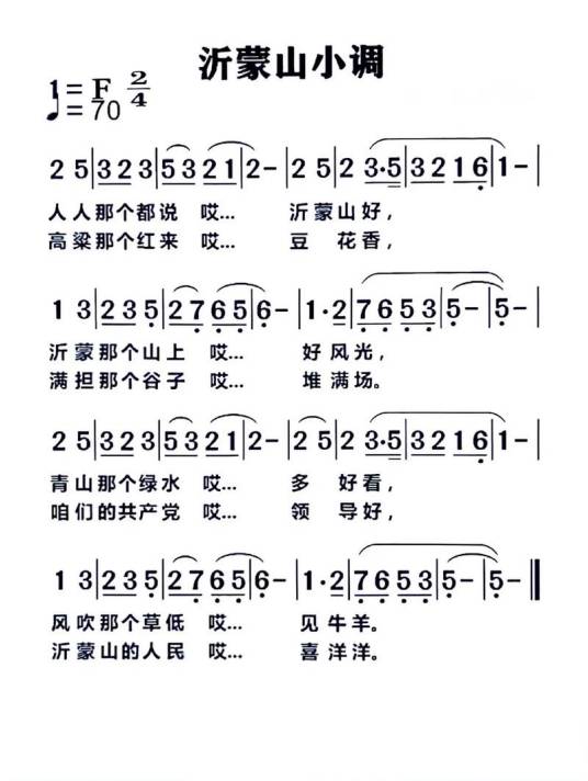 《沂蒙山小调》是由李林、阮若珊作词,李林作曲,李锐云、李广宗、王印泉整理修改,该曲于1953年首唱,随后于1957年6月随书籍《山东民间歌曲集》发行。《沂蒙山小调》以方言为媒介,将劳动、爱情、抗争等普世主题浓缩为“土气、大气、美气”的旋律,直抵人心柔软的角落。朴实无华的歌词下,抒发的是沂蒙人民对家乡的无限赞美、对美好生活的无限向往。经历王音璇、韦有琴、王世慧等经几代人的传承与演绎,这首民歌从沂蒙山走向祖国大江南北,走向了世界性舞台,成为中华民族鲜明的文化印记。沂蒙山小调与《茉莉花》同被联合国教科文组织列为中国最具代表性的两首民歌。2003年2月,该曲被定为山东省临沂市市歌。