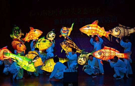 灯舞(沙头角鱼灯舞),广东省深圳市传统舞蹈,国家级非物质文化遗产之一。沙头角鱼灯舞起源于清代康熙年间,由沙栏吓村吴氏客家人的祖先迁至沙头角之后,结合本地民间习俗和早期从事海上捕捞的经验创作而来,至今已有三百多年的历史,是一种以鱼灯为道具的广场男子群舞。客家话里面“鱼”和“吴”发音相似,所以鱼灯舞也叫“吴”灯舞,它是本地渔民逢年过节、拜神祭祖、喜庆丰收的必备节目,流行于广东省深圳市盐田区沙头角街道及香港新界沙头角一带。沙头角鱼灯舞表演一般在晚上进行,舞蹈场地不用添加灯光,舞者保持低马步,巧妙地将身体藏于鱼灯背后,举着鱼灯下的短棍俯身曲背穿梭起舞,同时以锣、鼓、钹、唢呐、螺号等从旁伴奏。整个表演主要突出鱼灯的形象,以集中体现各种鱼类的普遍习性和个性。2008年6月7日,灯舞(沙头角鱼灯舞)经中华人民共和国国务院批准列入第二批国家级非物质文化遗产名录,项目编号:Ⅲ-45。