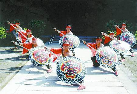 沙河藤牌阵,流行于河北省沙河市的传统体育活动,国家级非物质文化遗产之一。藤牌阵是中国古代战场实战技击项目,仅存于河北省沙河市十里铺村,当地人称之为“打藤牌”。沙河藤牌阵历史悠久,源自商代,真正传入邢台一带是在明代末年。表演阵法时,攻守方每队最少4人,藤牌兵左手执藤牌,右手执短刀,与4名攥三齿叉、大片刀、长矛或木棍者按阵法轮番打斗。2004年,沙河藤牌阵被列入河北省第一批非物质文化遗产保护名录。2006年5月20日,该遗产经中华人民共和国国务院批准列入第一批国家级非物质文化遗产名录,项目编号Ⅵ-13。