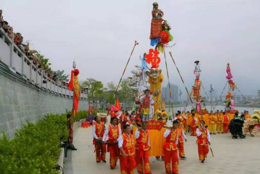 抬阁(芯子、铁枝、飘色)(河田高景),广东省陆河县民俗,国家级非物质文化遗产之一。高景是“飘色”的另一种称呼。河田高景是流传于广东省汕尾市陆河县河田镇的一种传统民俗,客家先民南迁到粤东山区以后,在交通相对闭塞的环境中形成了这种带有明显地方特色的民间艺术形式。河田高景表演定在每年农历的正月十九、二十两天,时间、路线和基本仪式都比较固定。河田高景由景床、景梗、景物三部分组成,景床是个长1.2米、宽1米、高0.8米的粗木架,用以固定景梗和景物;景梗是根长六到八米的锻造小钢条;景物由景童、景旦和道具组成,景童由十三四岁以下的少男少女担任,景旦由五六岁的小童担任,道具包括服装、饰品等。高景出游时,除景童、景旦外,每架景一般要配备四至八人负责抬景,六至八人负责导景,另有三四人担任护景,一两人担任监景。整架高景由四至六人抬着,在众人的严密监护下前行。高景之后跟随着众多的狮班、乐队和旗仗,共同组成一支庞大