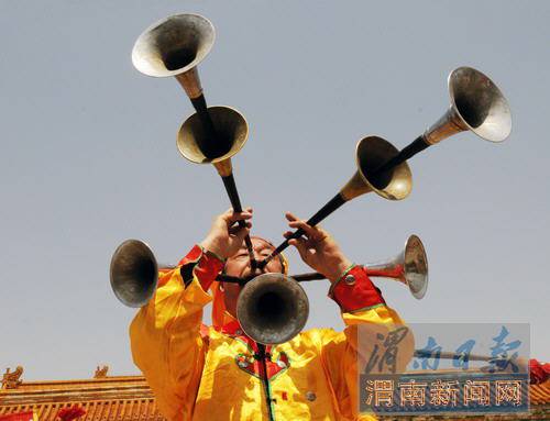 澄城鼓吹乐艺术是陕西省澄城县传统音乐形式,属陕西省省级非物质文化遗产,流传于沟南、沟北及城区等地。它以唢呐、海笛、笛、笙等乐器为主,分为粗乐(唢呐曲牌)与细乐(套曲)两类演奏形式,多用于婚丧寿喜等民俗礼仪活动。该艺术曲目涵盖传统曲牌、戏曲曲牌及民歌变奏,如《青天宫》《金摆场》等。演奏形式包括坐乐、站乐及融入杂耍的表演,调式以宫、徵为主,节奏多为4/4、2/4拍。沟北演奏风格粗犷豪放,沟南及城区则细腻委婉。现存曲谱含套曲、曲牌百余首,采用曲牌连缀、转调等手法形成套曲。其历史可追溯至汉魏时期,与古代战阵鼓乐及移民文化相关,清末民初融合东西路音乐特色发展成熟。传统演奏曾用工尺谱传承,部分古乐器如“嗡”已失传,现存曲谱多为近代整理。