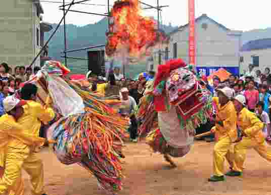 火狮舞是安徽省传统舞蹈类省级非物质文化遗产项目,2008年被列入第二批省级非物质文化遗产名录,申报地区为宣城市绩溪县,现主要流传于该县上庄镇。该艺术形式起源于明代,由当地纸扎师傅仿照岭北布狮舞创制,最初在中秋节夜晚随龙灯表演,后逐渐传播至岭北地区。火狮骨架以篾片扎制,狮身糊裱彩纸并内置蜡烛,通体透亮,表演时由两人操纵狮身,另有一人持火把喷撒松香粉形成火焰效果,配合锣鼓与唢呐完成动作。绩溪县通过非遗进社区、进农村、进校园等活态展演形式进行传承,并在春节、元宵节、中秋节等传统节日开展火狮舞表演活动。