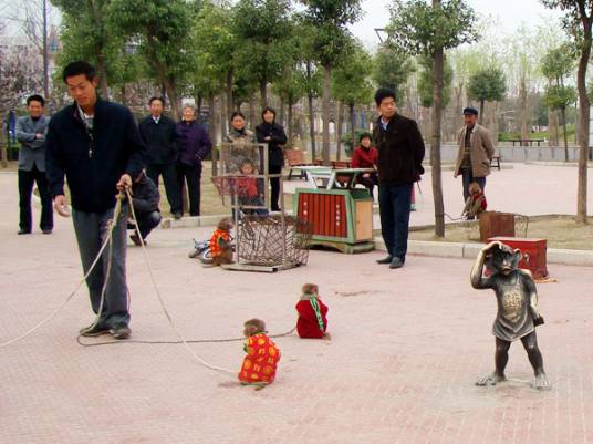 猴艺是中国传统民间艺术,萌芽于先秦,形成于西汉时期的河南新野县,以驯猴表演为核心,涵盖训猴、猴戏等体系,2009年被列为河南省非物质文化遗产。唐宋时期兴盛,明代达到鼎盛,清代至民国发展出戴面具的程式化表演。表演形式分为正戏(戴面具角色扮演历史人物)与杂戏(如《玩老杆》),形成“一根扁担两口箱”的流动表演模式。20世纪90年代起,《李氏一家》纪录片(1992年由中法电影公司合拍)及《动物王国窃案》电视剧推动猴戏影视化。现代因动物保护争议、法律限制及传统传承困境(家传绝活训练艰苦、生活水平提升导致传承意愿下降),从业者数量锐减,部分艺人转型为猕猴繁育或景区表演。