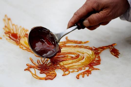 糖画是一种中国传统民间手工艺,以糖为材料制作而成,兼具观赏与食用功能,俗称“倒糖人儿”“倒糖饼儿”或“糖灯影儿”,2008年被列入第二批国家级非物质文化遗产名录。其制作工具为一勺一铲,糖料由红、白糖加饴糖熬制至可牵丝状,通过手腕控制糖液流速在大理石板上浇铸成型,最后粘接竹签,造型技法主要分为平面糖画与立体糖画两种类型,具体包括“大货”(复杂人物故事)、“子货”(圆形糖饼)、“丝丝货”(线描造型)和“小货”(简易动植物)四类。该技艺起源于宋代的故事人物造型,明代演变为祭祀用“糖丞相”,清代随移民文化传入四川后与川剧艺术融合,形成地域特色。2022年糖画技艺被列入四川省级非物质文化遗产代表性项目保护单位名单,主要流传于四川省成都市及周边地区。