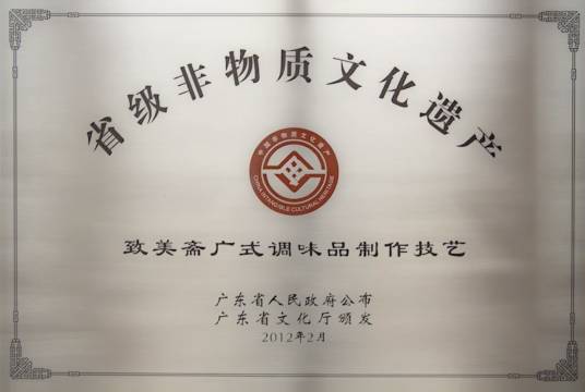 致美斋广式调味品制作技艺,广东省广州市传统技艺,广东省省级非物质文化遗产之一。致美斋于明万历三十六年(1608年)创号,坚持以古法生产、传统口味为核心,产品分为酱油、食醋、蚝油、南腐乳、调味酱、调味汁、调味粉、调味油等大类。保留明、清至民国造酱油及酱用的“石冲”和瓦缸共计500多个,以及有关工具“篘”,用于晒制天顶头抽、双璜生抽和酿造面酱。致美斋调味品的生产均坚持采用传统工艺为核心,包括酱油的高盐稀态常温发酵工艺、食醋的醋酸菌发酵工艺等。2011年6月31日,致美斋广式调味品制作技艺被广州市人民政府列入广州市第三批市级非物质文化遗产名录,序号为9。2012年2月21日,致美斋广式调味品制作技艺被广东省人民政府列入广东省第四批省级非物质文化遗产名录,项目编号为VIII-43。