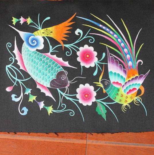 现在的苗画依然保留了服饰、被面、床帘、门帘、堂帘、床沿、壁挂、佩饰等样式,其内容多表现喜庆吉祥、人寿年丰的主题。作品构图大胆,线条有致,色彩丰富协调,艳而不俗,具有鲜明的民族特色。