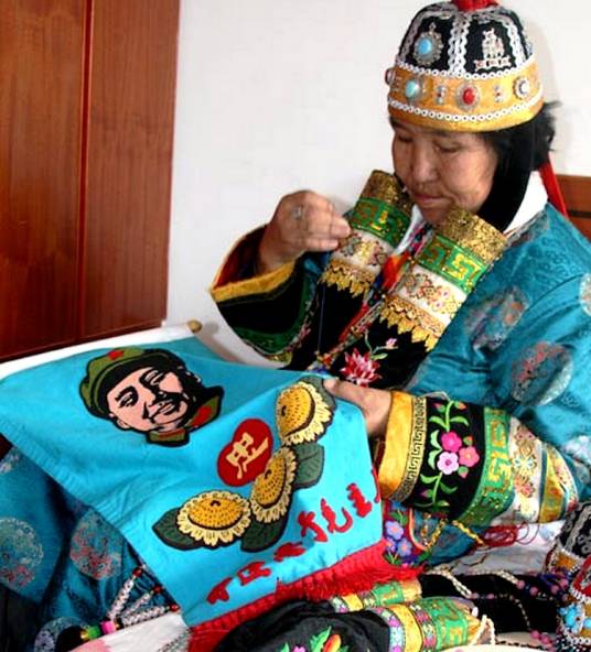 蒙古族刺绣,是中国蒙古族人民在长期生产生活中形成的一种手工技艺。蒙古族刺绣不但在软面料上绣花,而且要用驼绒线、牛筋等在羊毛毡、皮靴等硬面料上刺绣。从刺绣的针法上看,蒙古族妇女刺绣时所用的顶针与农耕民族劳动妇女所用的顶针不同。蒙古族的刺绣艺术以凝重质朴取胜。其大面料的贴花方法,粗犷匀称的针法、鲜明的对比色彩,给人以饱满充实之感。2008年,入选中国第二批国家级非物质文化遗产目录。