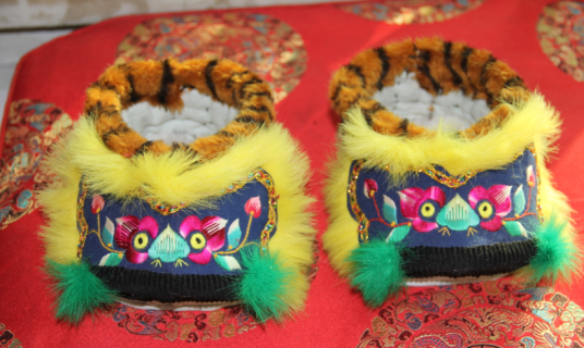 虎头鞋是中国传统手工艺品,因鞋头呈虎头造型得名,北方地区亦称猫头鞋。其制作需经过打袼褙、剪裁底样、纳鞋底、绣虎脸等数十道工序,采用刺绣、拨花、打籽等针法,以红黄为主色调,用粗线条勾勒虎嘴、眉毛等部位突出威猛形象。鞋底多为双层,针脚四组每组八针寓意“四平八稳”,虎须五针象征“五谷丰登”。该童鞋通常在幼儿学步期穿着,鞋底宽大便于行走,兼具保暖透气功能。民间认为其具有驱邪护佑的吉祥寓意,部分地区保留姑姑制作蓝、红、紫三色鞋的习俗,分别象征拦截灾祸、驱除邪祟与健康成长。现代衍生出孔雀头、鲤鱼头等变体,并融入冬奥雪花、溧水文化等元素,开发出百余种新款。多地通过非遗课程、文创产品推广虎头鞋制作技艺,建立老中青三代传承队伍。