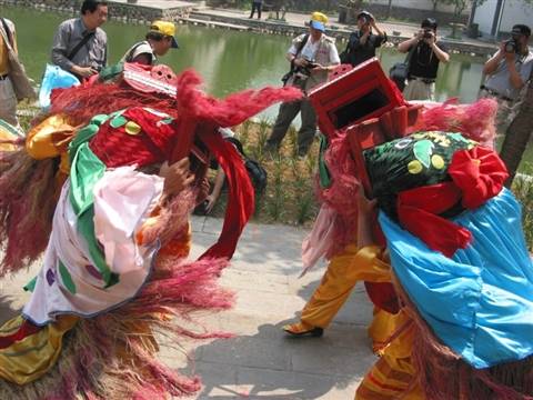 貔貅舞是广东湛江吴川市梅菉头村的传统民俗舞蹈,起源于"神童紫微降服貔貅造福乡民"的传说,传承至今已有千年历史,主要流传于梅菉头村及黄坡镇。该舞蹈于新春、元宵等节庆期间表演,以祈福驱邪、保佑平安,常与武术队伍、飘色表演共同游行,道具貔貅头由竹篾扎制并饰以兔毛或羊毛条纹,尾部缀羊毛,下颌可开合模拟动物动作。表演包含"貔貅出动""紫微降服"等套路,融合武术动作与杂技技巧,形成"牌山采青"等特色形式。貔貅舞在20世纪50年代与武术结合创新出叠罗汉技法,1980年代发展为四层人塔的高空采青表演。2006年被列入广东省非物质文化遗产名录。表演时需配合紫微、土地公、樵夫等角色,现存传承体系以师徒互教为主。