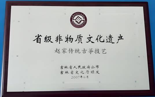 赵家传统古筝技艺是吉林省首批省级非物质文化遗产项目(2007年认定),源自山东筝派,由赵玉斋、赵登山师徒确立,经八代传承形成融合东北地域特色的演奏体系。2020年获长春市第一批市级非遗传承基地命名,后升级为省级传承基地。2024年12月,多国驻华使节在吉林参访时体验了赵家传统古筝技艺。该技艺以左手滑、按、揉、颤技法的复合运用为核心,推崇"音韵相合""以韵托声"的艺术理念,保留山东筝派"大指小摇"技法并融入东北二人转、吉剧等民间音乐元素,代表曲目包括《关东潮》《松花湖渔歌》等。通过翻译古代工尺谱为现代简谱进行传习,并出版《山东筝派古曲集》等教材。其历史可追溯至清代山东筝派张念胜谱系,赵玉斋传至赵登山后,赵登山1954年调入吉林省歌舞团推动技艺在东北传播。现有传承谱系涵盖赵峰(第五代省级传承人)、赵晓筝(第六代)等分支,形成覆盖东北及全国的传承网络。
