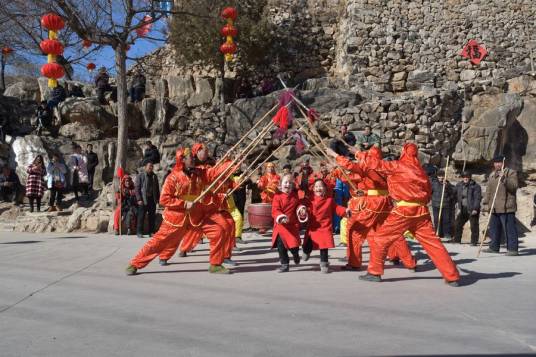 跑帷子具有古代战争和民间祭祀活动的双重特点,与其他舞蹈相比,其舞步、阵式、道具、配乐等都别具一格,有着独特的艺术魅力。它由72名青壮年男性表演,每人手持一根染成红黑两色的木质长杆,杆顶上以彩带饰出帷幔式的“帷子”。演出时,舞者排成队列,以屈膝微蹲的姿势有节奏地小跑步前进,形成“围魏救赵”、“炮打香烟城”、“李渊劝将”等各种不同的阵式,并以“议事、演古、迎驾、送官”的仪式与之相配合。 <br />
