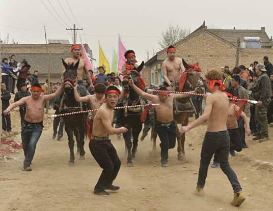 跑骡车又称民间社火舞蹈,是陕西省渭南市临渭区、大荔县等地流传的古老民俗活动,起源于明末清初的“祈年成”与庆丰收习俗,以故市一带的表演最为驰名,2009年被列入陕西省第二批省级非物质文化遗产名录,2025年大荔县申报的《大荔跑骡车》入选陕西省第八批省级非物质文化遗产名录。该活动融合了农耕文化与冷兵器时代战争元素,由民间自发组织,常见于春节、元宵节及婚丧嫁娶等场合。活动以胶轮或皮轮骡车队列为核心,每辆车由四匹或五匹头挂彩旗、项系铜铃的骡子牵引,排列方式常为前三后一二,车上载有身着传统服饰的锣鼓队。表演时,吆车人甩鞭为号,骡车疾驰中锣鼓声、铜铃声与观众喝彩交织,至开阔场地后表演“璞鸽踅窝”等特技。骡车队常包含多辆骡车,每辆前后配备吆车的、骑骡的、扛车等人员,队伍规模可达四十余人。传承者如王银合等已参与数十年,通过自发组织维系这一民俗。