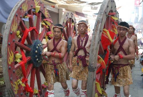 轩辕车会又称“车公会”或“车会”,是安徽省黄山市黄山区民众为纪念轩辕黄帝而举行的民间庆祝活动,每年农历七月十八至廿四日举办。黄山区自2013年开始组织开展清明黄帝祀典活动,轩辕车会作为其中一部分,已被公众推荐为除陕西黄陵县、河南新郑市、浙江缙云县之外的第四处轩辕黄帝祭祀点,在全国形成了“东南西北祭黄帝”的格局。该活动起源于唐代天宝年间,黄山先民为纪念轩辕黄帝传播造车技术及中原文明而设,其起源有多个传说。包含洗车、试车、正车、祭车、收车五大仪式流程。核心内容为滚车表演,参与者持红漆木制大车轮(重约百斤),以平滚、螺旋滚等技法巡游祠堂庙宇,配合傩面装饰及锣鼓爆竹,寓意驱邪纳福。滚车技法包括平滚、夹篱笆阵、飘反车、发绕车、拍绕车、螺旋滚等多种。男性青壮年无偿参与,鼎盛时达上千人。随着时代变迁,活动从传统祭祀发展为融合观赏性与参与性的节庆形式,并具有健身娱乐功能。2006年列入安徽省非物质文化遗产