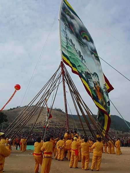 <p>迎大旗在每年农历十月十六举行,程序严谨,包含祭旗、穿旗、竖旗、迎旗、收旗5个主要环节。首先是祭旗,由各村大旗队持旗头和福礼到玉山茶场庙祭拜茶神。而后是穿旗,各队分工组装旗杆、旗面、旗头,绑拢耸竹,系旗索,以备竖旗。接下来的竖旗和迎旗,是活动的核心环节。竖旗时,队员分工协作,分别用撬杠、旗叉、拢耸竹和旗索,在5分钟内将近2吨重的大旗竖起。待大旗竖起后,持拢耸竹、旗索的人员以旗杆为圆心形成伞状排列,将旗杆固定住。迎旗时,由1人负责指挥,20余名队员将旗杆凌空抬起,剩余队员则控制旗杆缓缓移动,绕场“迎旗”。最后是收旗环节,大旗回到原点,众人缓缓平放大旗。整个过程,需80至100名壮汉分工协作完成。大旗制作技艺精湛,旗面近600平方米,上绘龙虎图案,旗杆高30余米。参与活动各村以旗杆高度、旗面大小、绘画水准、迎竖技巧等为标准互竞高下,以高、大、精、巧者为胜。迎大旗多以群体传承和口传心授的方式沿袭。通常以村落为单位成立大旗队,每个队参与人数不等,少则几十,多则上百。其队员是项目的直接传承者,他们与从事吹打、绘画环节的人员共同构成传承群体。</p>