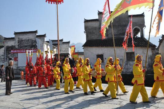 郭村周王会,安徽省第四批省级非物质文化遗产,是黄山市焦村镇郭村林氏家族为纪念周文王、周武王举办的年度祭祀民俗活动,源于林氏族人追溯比干后裔身份的传统。据载,商末比干因谏纣王被杀,其妻携子坚避难长林石室,周武王伐纣后赐姓林氏。后世为感念周文王、周武王护佑之恩,林氏族人始建周王庙并举办庙会。该活动以周王护佑传说为核心,每年农历九月二十四日由百余人仪仗队巡游,成员头戴竹编面具,持龙、狮、佛手等二十四支銮驾及彩旗,沿石壁下、岩寺、郭村行进,沿途村庄以鞭炮锣鼓迎送。巡游至观音阁后设百碗供品并连日唱戏,形成集信仰祭祀、商贸交流、文化传播于一体的民间盛会。正月期间村民仍持竹叶至周王庙祈福,此民俗活动延续至建国初期。