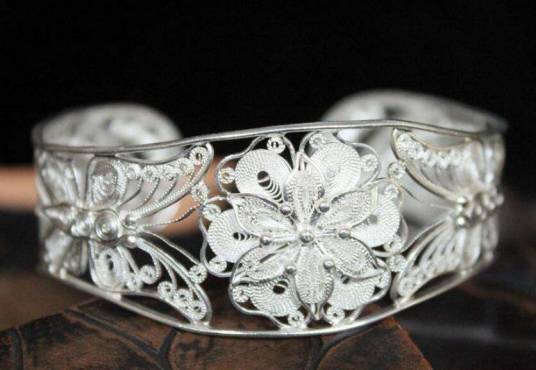 <p>畲族民间银饰制作技艺以畲银打造为主,并融合汉族金银匠的风格,其制品包括头饰、发饰、服饰、带饰、手镯、脚镯、儿童什锦铃、餐具、酒具、茶具、摆件等。宁德畲族银器锻制技艺制作过程繁复,以浇铸成型、錾刻细部式为例,其工序涉及熔银、倒条、打型、切料、锤揲、雕刻、焊接、煮银、清洗等环节。这一技艺除了保留传统的制作技法,还融汇“圆雕、镂空雕、浮雕、平雕”四种工艺,在焊接、镶嵌、点翠、珐琅等工艺技术上都有特别之处。宁德畲族银器锻制技艺讲究玲珑典雅,主要体现在浇铸成形,錾刻细部;锤錾为主,錾刻、镌镂为辅;无缝焊接;与花丝工艺和镶嵌点翠或珐琅相融合;传统的刮光和煮银泡洗技术等方面。</p>