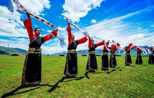 锅庄舞(玉树卓舞),青海省玉树藏族自治州传统舞蹈,国家级非物质文化遗产之一。玉树卓舞流传于青藏高原腹地青海省西南部的玉树藏族自治州一带。卓舞的历史渊源可以追溯到原始社会,玉树卓舞中到当下还保留着较多远古时代的痕迹,随着藏族六大氏族的形成,玉树卓舞逐渐以部落、部族和区域文化的形态发展起来。玉树卓舞种类繁多,其内容以对家乡、自然风光等的歌颂为主,同时广泛反映社会生活的各个方面。完整的演出分祭奉神佛的序舞、表现广泛内容的正部、祝福吉祥的尾声三个部分。玉树卓舞按功能可分世俗性较强的普通卓舞和宗教色彩较浓的“法”卓(藏语称“曲”卓)两类,整体结构由从慢到快两部分组成,以载歌载舞的形式进行表演。 2006年5月20日,锅庄舞(玉树卓舞)经中华人民共和国国务院批准列入第一批国家级非物质文化遗产名录,项目编号Ⅲ-20。