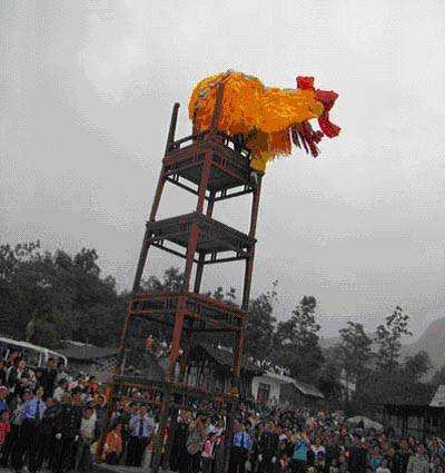 高台狮舞是仡佬族集杂技、舞蹈与体育为一体的民间表演艺术,最早可追溯至清朝中晚期,起源于19世纪中叶黔东北地区,是我国现存唯一以方桌叠台为表演载体的狮舞形态。表演者需在叠加数层的方桌上完成“鹤立峰顶”“悬空立柱”等高难度动作,最高可搭建至十二层方桌,采用无保护措施的惊险表演形式。该艺术包含地面狮舞与高台狮舞两类分支,核心动作体系涵盖12种套路及36式阵法,其“险、奇、巧”的技艺特征体现了仡佬族对自然力量的崇拜。伴奏乐器以锣鼓类打击乐为主,学界认定该艺术具有民族学、民俗学与体育史研究三重价值。清道光年间彭水“陈家玩班”创立完整表演体系。1950年代传入务川自治县后发展为仡佬族标志性艺术。2008年经系统普查后建立档案数据库。2011年被列入第三批国家级非物质文化遗产名录。现存唐家班、李天阳狮舞班等代表性传承群体。通过文旅融合焕发新生机,2024年央视春节专题报道赞誉其为“空中芭蕾”。