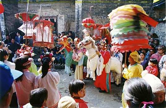 麒麟白马舞是流传于广东封开县及广西苍梧县等地的传统民间舞蹈,起源于唐代莫宣卿高中状元后衣锦还乡的典故,2009年被列入广东省第三批省级非物质文化遗产名录。该舞蹈宋初被编创为表演形式,表现状元省亲的欢乐场景及其坚贞不渝的爱情。表演队伍由20人组成,男女分饰状元夫妇骑乘白马、麒麟,配以童子引路、罗伞花灯及锣鼓乐队,按东南西北方位穿插变换队形,动作丰富多变。舞蹈伴随封开山歌《麒麟白马曲》演唱,道具横额书有“麟吐玉书”字样,采用大鼓、大镲等乐器营造热烈节庆氛围,多在春节巡演。封开县大洲镇曾代表肇庆市参加省级艺术展演,并在学校设立传承基地。广西苍梧县2014年将其列入自治区级非遗名录,两地通过跨省巡演传承文化内涵,展现民众对美好生活的祈愿。